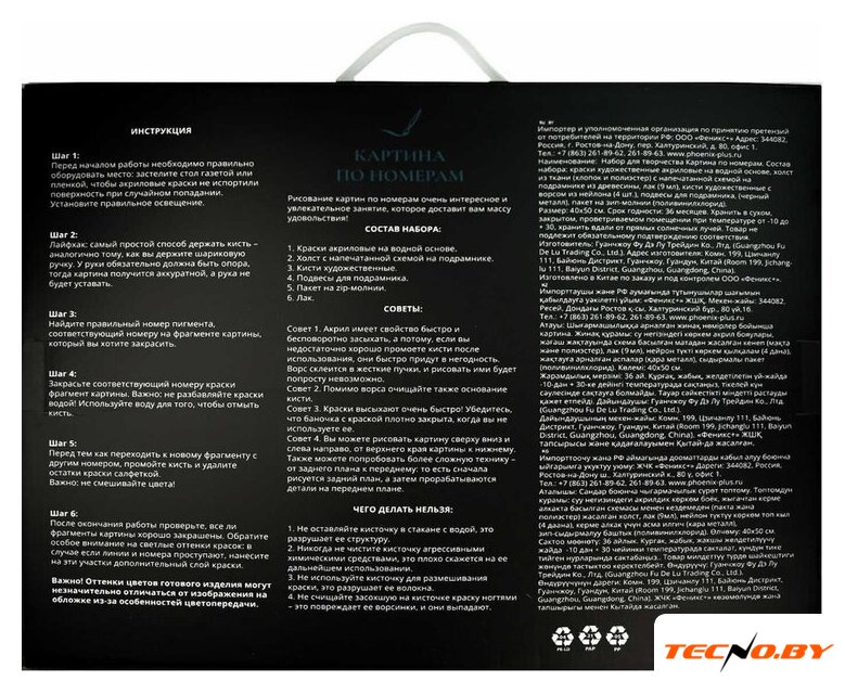 | Комплектация | холст, краски, кисти (4 шт.), лак, пакет, крепление, контрольный лист |