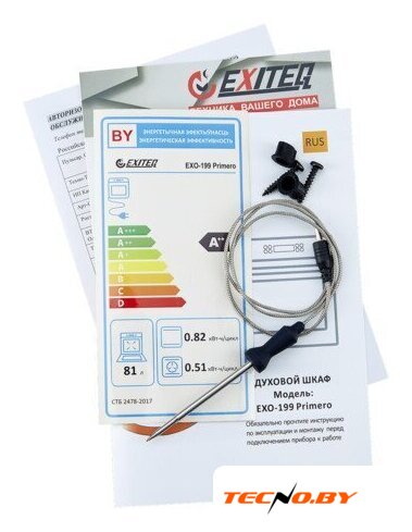 | Дополнительные принадлежности | - Разделитель для духовки, - Универсальный держатель для решетки и противней, - Хромированная рамка для вертела, - 2 съемные ручки для переноски духового шкафа, - 2 винта для крепления духового шкафа в кухне, - 2 уплотнительных кольца для установки, - Инструкция по эксплуатации |