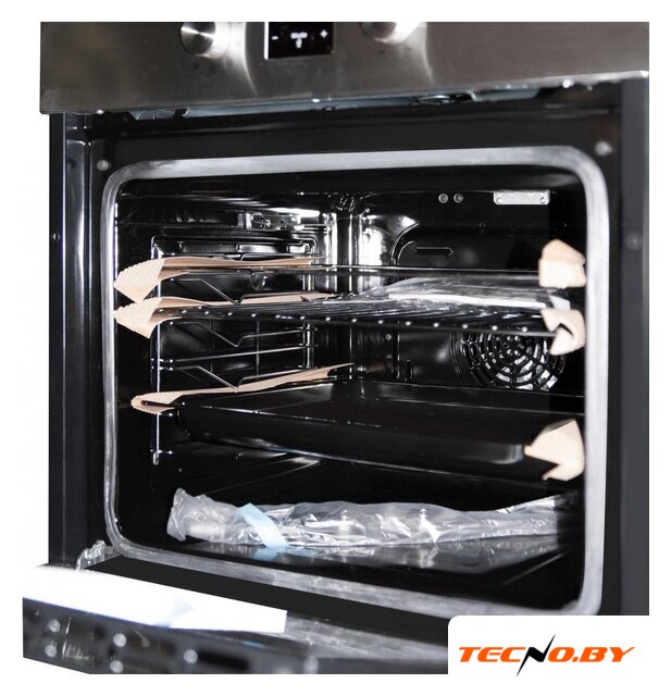 В комплекте с духовкой идут вертел для идеального жаркого, глубокий и стандартный эмалированные противни, а также решетка. Шкаф выполнен в стандартных размерах — высота 59,5 см, глубина 57,5 см, ширина 59,5 см, что облегчает его установку в любой кухонный гарнитур.