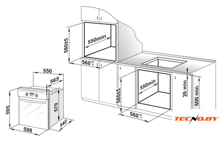 Шкаф разработан для легкой интеграции в кухонные гарнитуры с размером ниши для встраивания 58х56х55 см, а его собственные размеры составляют 59.8х56.5х59.5 см, что делает его подходящим для подавляющего большинства современных кухонь.