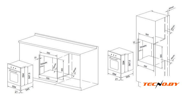 В комплект входит эмалированный глубокий и стандартный противни, а также решетка. Противни можно легко вставить и извлечь благодаря проволочным и телескопическим направляющим. Размеры устройства — ширина 59.4 см, глубина 56.6 см и высота 59.4 см. Для встраивания требуется ниша чуть большего размера, что обеспечивает плотное прилегание и гармоничный внешний вид в интерьере.