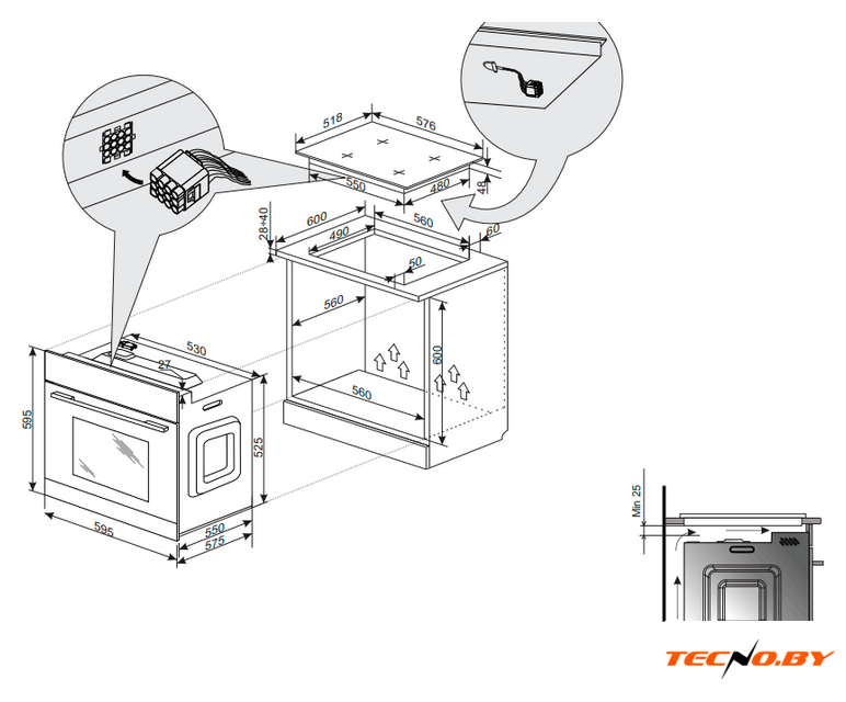 электрический с конвекцией, объем 60 л, 8 режимов, очистка ручная, проволочные направляющие, телескопические направляющие, энергопотребление A