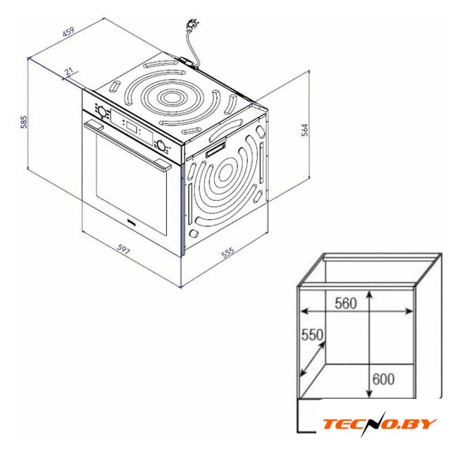 электрический с конвекцией, объем 57 л, 7 режимов, очистка ручная, проволочные направляющие, энергопотребление A