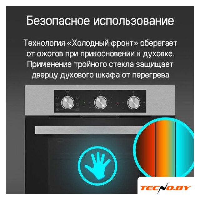 Духовой шкаф оснащен тройным стеклом дверцы, что не только обеспечивает лучшую теплоизоляцию, но и повышает безопасность использования, предотвращая нагрев внешней поверхности дверцы. Максимальная температура работы достигает 250°C, что позволяет готовить любые блюда в кратчайшие сроки.