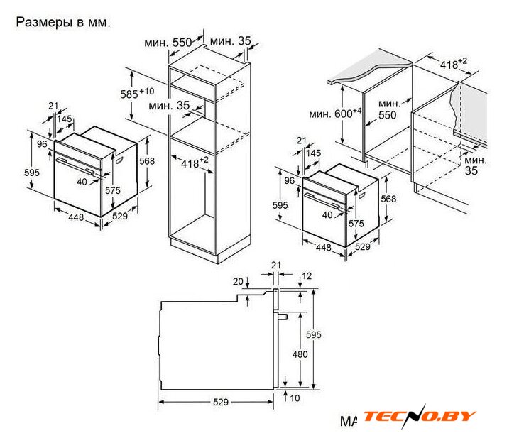 электрический с конвекцией, объем 60 л, утапливаемые переключатели, 8 режимов, очистка ручная, направляющие проволочные