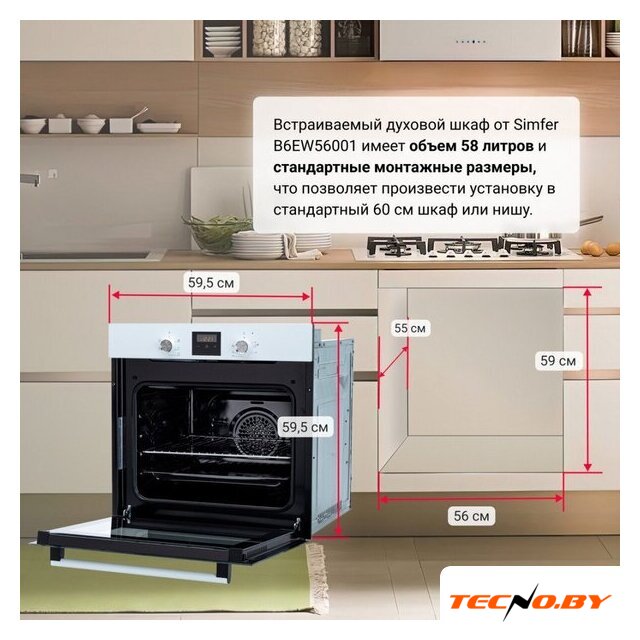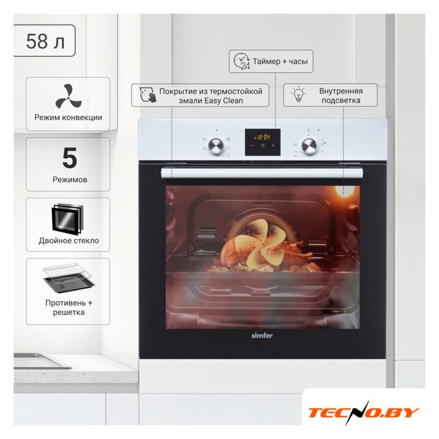 Simfer B6EW56014 поставляется со стандартным эмалированным противнем и решеткой, что обеспечивает всё необходимое для начала использования. Шкаф идеально впишется в нишу размером 59х56х55 см, а его вес в 24 кг и удобные размеры добавляют простоты в установку и крепление в кухонном гарнитуре.