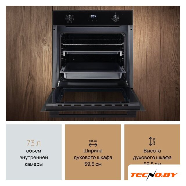 В комплект духового шкафа входят стандартный и глубокий эмалированные противни, а также решетка, что открывает разнообразные возможности для готовки. Габариты устройства составляют ширину 59.5 см, глубину 56 см и высоту 59.8 см, а для встраивания требуется ниша размером 60x60x56 см. С весом 28.4 кг, этот духовой шкаф станет надежным помощником на вашей кухне.