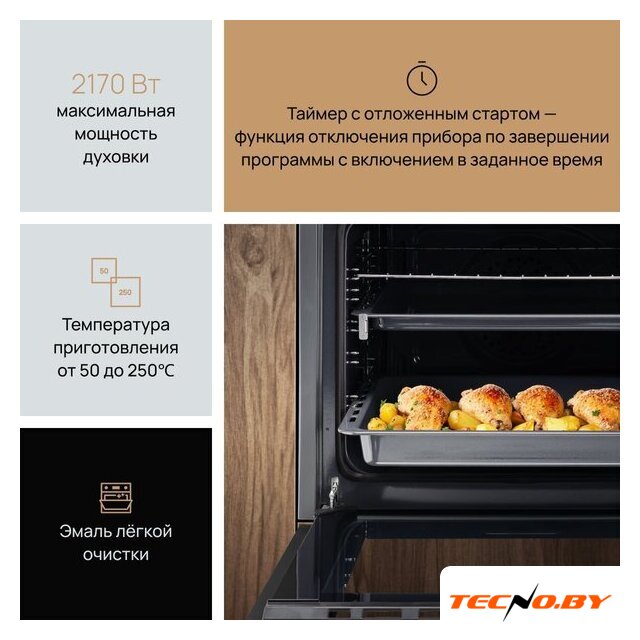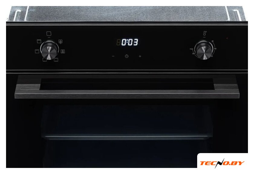 Электронное управление духового шкафа проходит через светодиодный экран, что упрощает использование и контроль приготовления. Среди функциональных особенностей — таймер, звуковой сигнал, термостат и освещение. Таймер данной модели работает без отключения программы, что позволяет вам быть уверенными в точности и качестве готовки.