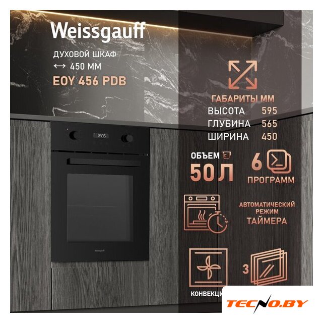 электрический с конвекцией, объем 52 л, 10 режимов, очистка ручная, 3 стекла в дверце, направляющие проволочные + телескопические (1 уровень)