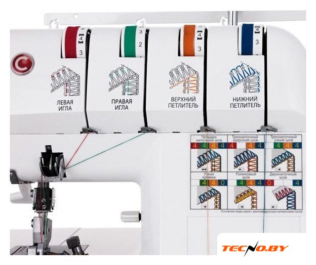 оверлок; рабочих нитей: 2, 3, 4; максимальная длина строчки: 4 мм; регулировка давления лапки