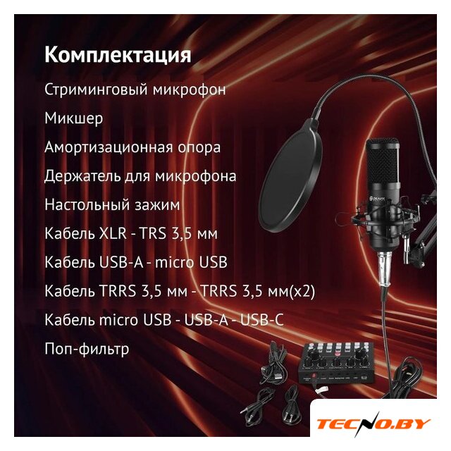 Полная комплектация набора | - Микрофон проводной SM-600G; - Микшер;- Амортизационная опора;- Держатель для микрофона;- Настольный зажим;- Кабель XLR - TRS 3,5 мм;- Кабель USB-A - micro USB;- Кабель TRRS 3,5 мм - TRRS 3,5 мм (х2);- Кабель micro USB - USB-A - USB-С;- Поп-фильтр; |