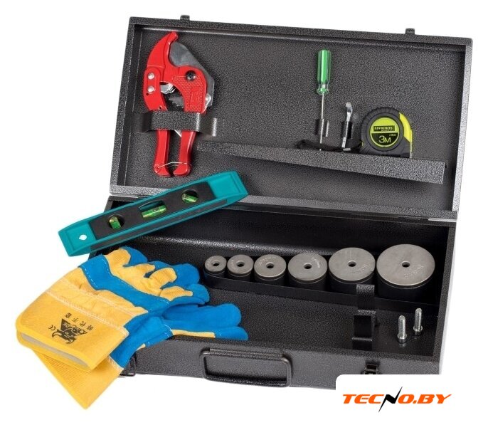 | Комплектация | 6 насадок (20, 25, 32, 40, 50, 63 мм), ножницы, 6-гранный ключ, рулетка, отвертка, перчатки, уровень, металлический кейс |