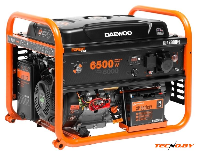 Daewoo Power GDA 7500DFE оснащен розетками 220 В на 16 и 32 А. Его стильный черно-оранжевый дизайн делает его не только практичным, но и эстетически приятным дополнением к вашему рабочему пространству.