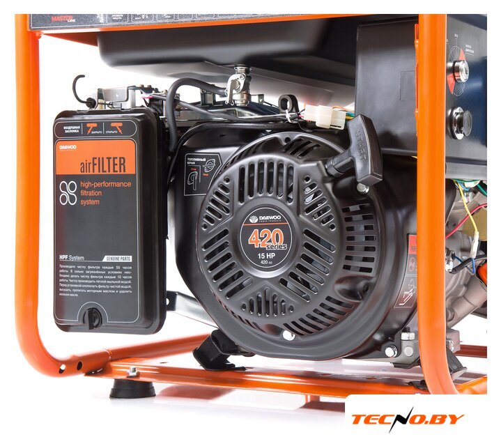 В основе Daewoo GDA 7500DPE-3 лежит мощный четырехтактный бензиновый двигатель серии 420 с объемом 420 см3. Он может похвастаться системой запуска на выбор: ручной или электростартер, делая процесс запуска быстрым и простым. Емкость топливного бака в 30 литров позволяет работать без перерывов до 17 часов при 50% нагрузке, что делает этот генератор идеальным для длительных задач.