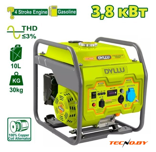Хотя Dyllu DTGEAB06 не является переносным устройством, его компактные размеры и вес в 30 кг позволяют легко находить ему место в вашем гараже или складском помещении. Открытое исполнение конструкции упрощает обслуживание и управление всеми функциями генератора, помогая продлить срок его службы.
