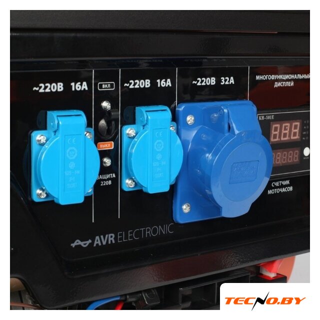 Оснащение синхронным генератором и защитой от перегрузки гарантирует безопасность эксплуатации. Наличие вольтметра позволяет контролировать уровень напряжения, избегая возможных перегрузок. Легкий доступ к розеткам 220 В на 16 А и 32 А (2 x 16А и 1 x 32А) упрощает подключение устройств.