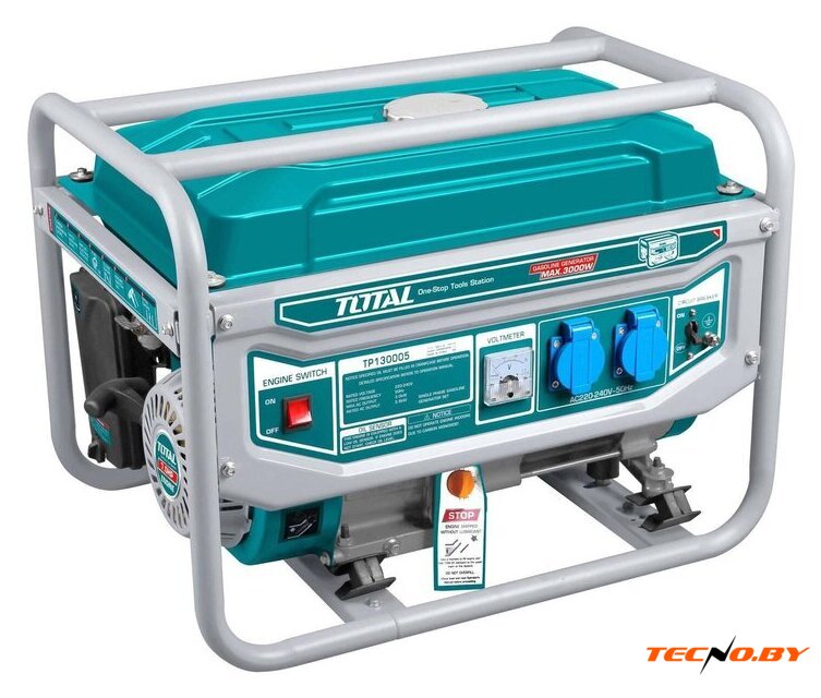 Total TP130005 снабжен синхронным генератором с розеткой на 220 В (16 А), которая позволяет подключать бытовые приборы и электроинструменты. Встроенный вольтметр дает возможность контролировать напряжение и поддерживать стабильную работу оборудования. Несмотря на свою мощность, уровень шума, издаваемый этой моделью, составляет 95 дБА, что является стандартным показателем для подобных устройств.