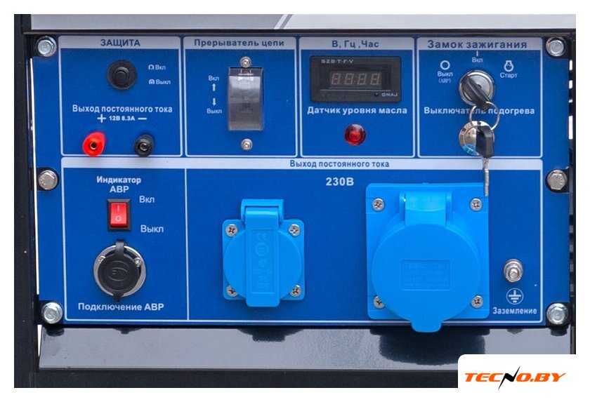 Генератор оснащен розетками на 16 А и 32 А, обеспечивая стабильное подключение к устройствам и инструментам, требующим переменного тока 220 В. Все элементы оснащены защитой от перегрузки, что гарантирует безопасность эксплуатации и защиту подключенных приборов. Встроенный вольтметр позволяет контролировать параметры выходного напряжения, обеспечивая уверенность в корректной работе оборудования.