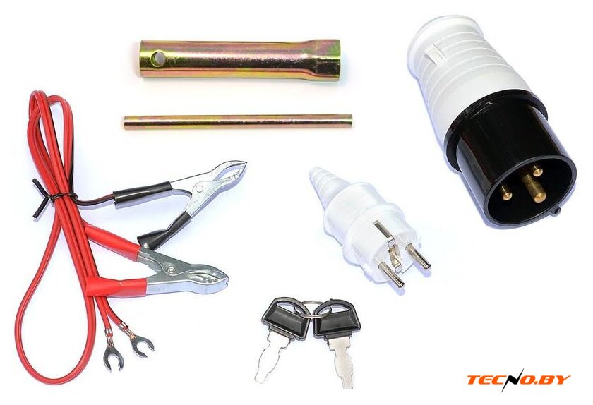 В комплекте с генератором поставляются руководство по эксплуатации, гарантийный талон, аккумуляторная батарея, соединительный комплект, а также колеса и ручки для транспортировки, что делает его простым и готовым к использованию сразу после покупки.
