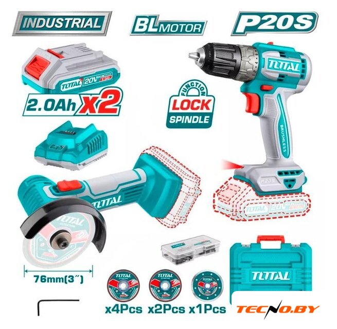 | Комплектация | Дрель-шуруповерт TOTAL TDLI20453 - 1 шт. Мини-пила TOTAL TCKLI20278 - 1 шт. Аккумулятор 2,0 А*ч - 2 шт. Быстрое зарядное устройство - 1 шт. Диск отрезной для пилы 76 мм - 4 шт. Диск шлифовальный для пилы 76 мм - 2 шт. Диск алмазный для пилы 76 мм - 1 шт. Набор набор аксессуаров 47 шт. Инструкция Кейс |