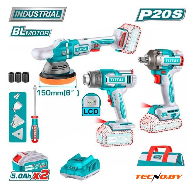 | Комплектация | - Гайковерт TIWLI20401 - 1 шт.- Полировальная машина TOTAL TAPLI20151 - 1 шт.- Фен строительный TOTAL TBLI2003 - 1 шт.- Аккумулятор TFBLI20531 5,0 Ач - 2 шт.- Зарядное устройство TFCLI2001 - 1 шт.- Насадка для фена - 3 шт.- Торцевые головки (17, 19, 21 мм) - 3 шт.- Полировальная насадка - 1 шт.- Сумка.- Коробка. |