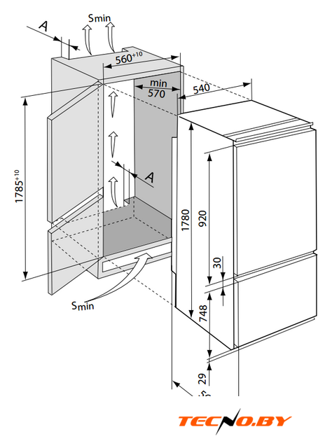 встраиваемый, жесткое, No Frost (морозильная камера), механическое управление, класс A, перенавешиваемые двери, лоток для яиц, 54x54.5x177.5 см, белый