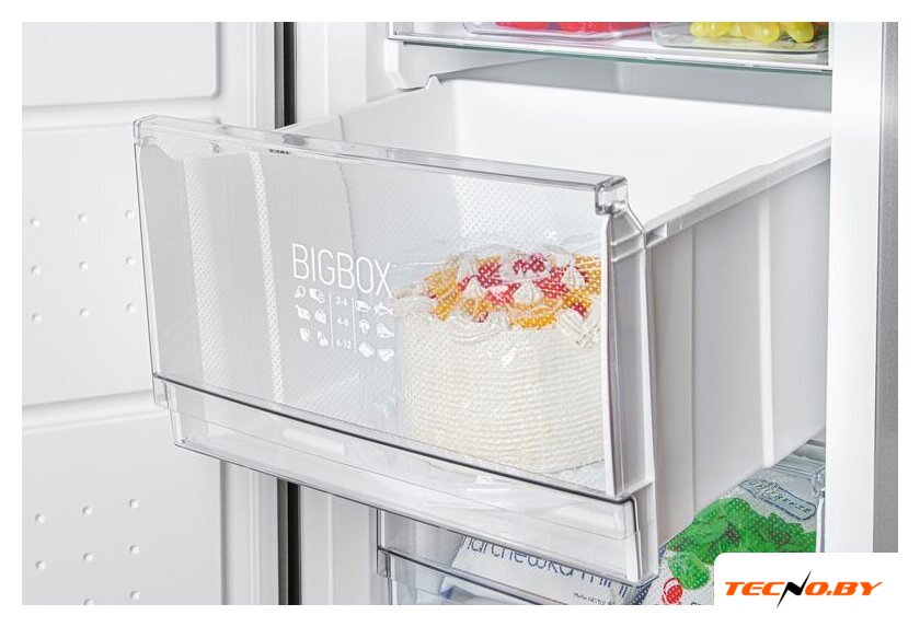 отдельностоящий, без No Frost, электронное управление, класс A+, полезный объём: 370 л (251 + 119 л), зона свежести, перенавешиваемые двери, выдвижной/подвесной контейнер, лоток для яиц, 59.5x62.7x206.8 см, серебристый