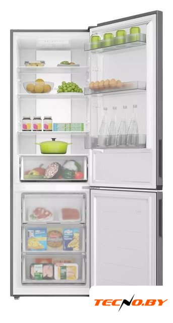 отдельностоящий, полный No Frost, сенсорное управление, класс A, полезный объём: 298 л (191 + 91 л), зона свежести, перенавешиваемые двери, лоток для яиц, 59.5x59x185 см, серебристый
