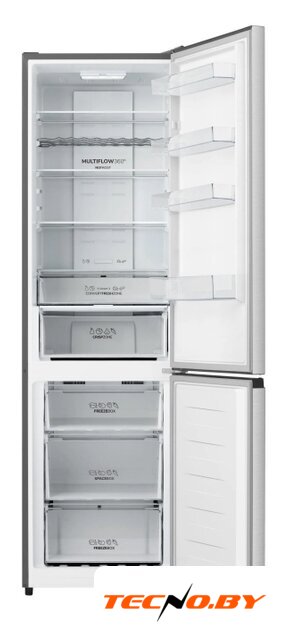 отдельностоящий, полный No Frost, электронное управление, класс A+, полезный объём: 331 л (235 + 96 л), перенавешиваемые двери, лоток для яиц, 60x59.2x200 см, серебристый