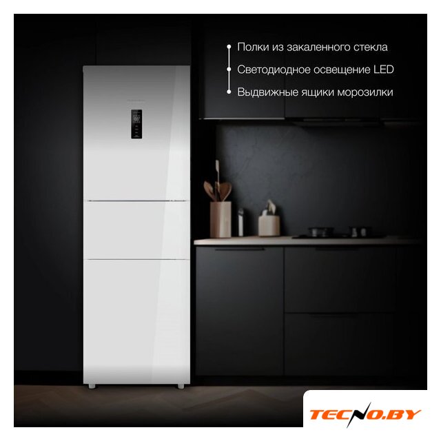отдельностоящий, полный No Frost, электронное управление, класс A+, полезный объём: 302 л (223 + 79 л), инверторный компрессор, перенавешиваемые двери, лоток для яиц, 59.5x65.5x190.7 см, белый