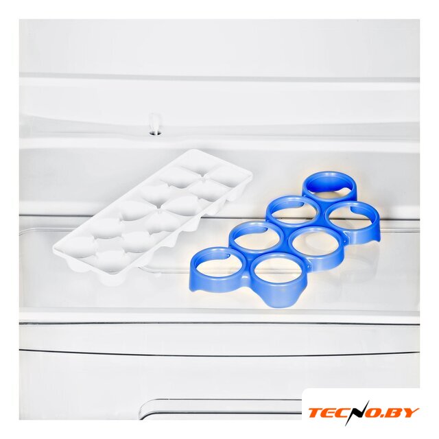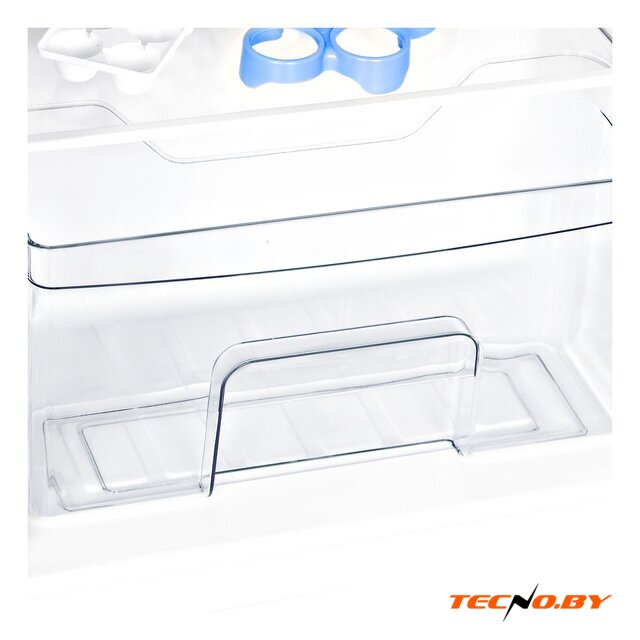 Внутреннее пространство холодильника хорошо организовано благодаря трем стеклянным полкам и одному ящику для овощей и фруктов. Также имеются три дверных балкона из пластика, которые удобно расположены для хранения различных мелочей. Комплектация включает в себя лоток для яиц, что добавляет удобства в повседневной эксплуатации.