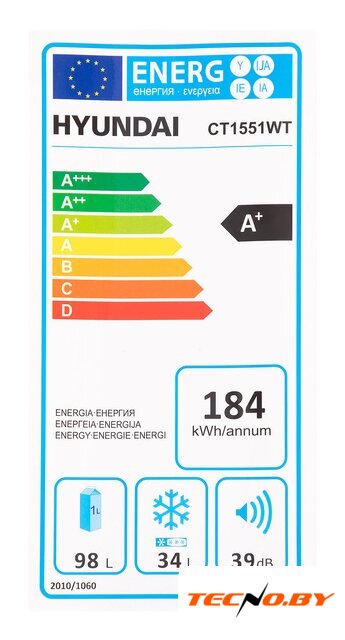 Холодильник Hyundai CT1551WT отличается высокой энергоэффективностью, соответствуя классу A+, что позволяет минимизировать затраты на электроэнергию. Его годовой расход составляет всего 184 кВт·ч. Несмотря на систему охлаждения без No Frost, холодильник функционирует надлежащим образом, поддерживая свежесть продуктов. Уровень шума в 39 дБ гарантирует, что его работа практически не будет заметна.