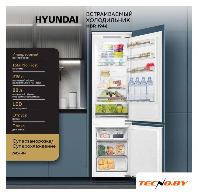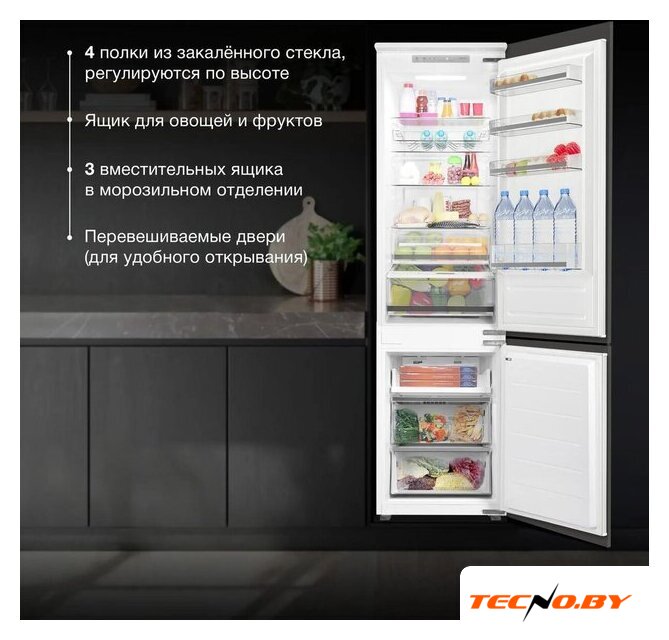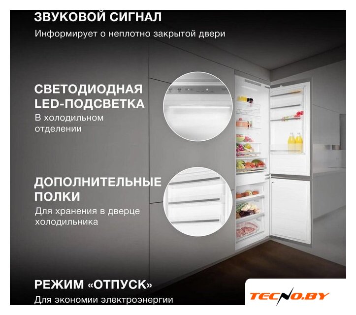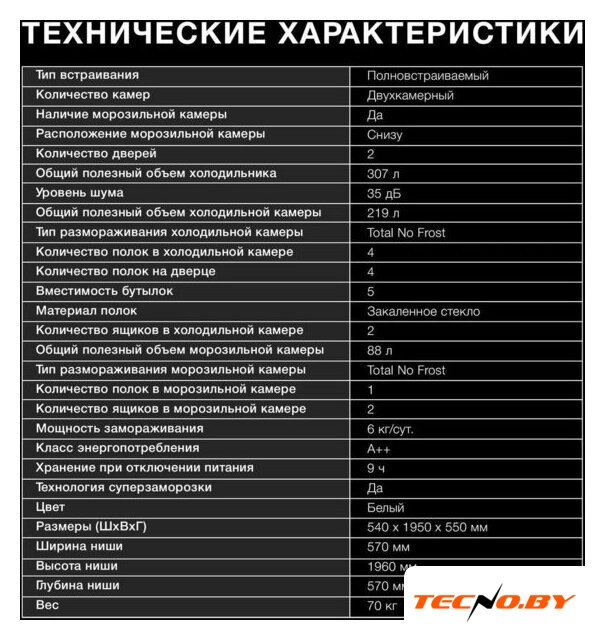 встраиваемый, жесткое, полный No Frost, электронное управление, класс A++, полезный объём: 307 л (219 + 88 л), инверторный компрессор, перенавешиваемые двери, 55.8x55.8x194 см, белый