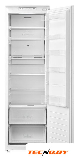 встраиваемый, скользящие направляющие, полный No Frost, электронное управление, класс A+, полезный объём: 254 л (185 + 69 л), зона свежести, перенавешиваемые двери, полка для вина, лоток для яиц, 54x54.5x177.5 см, белый