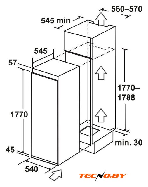 Морозильник имеет габариты: ширина 54 см, глубина 54.5 см и высота 177 см, что делает его идеальным для встраивания. Он весит 59 кг и рассчитан для установки в нишу размерами высотой 177-178.8 см, шириной 56 см и глубиной 54.5 см, что обеспечивает легкость в монтаже даже в ограниченном пространстве.