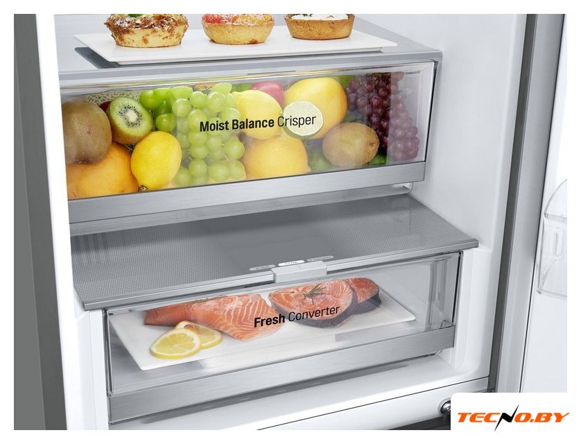 Фруктам и овощам подойдет наличие двух ящиков с регулировкой влажности, а также антибактериальный фильтр для защиты содержимого от бактерий. Пластиковые дверные балконы составляют 4 отделения, а дополнительный лоток для яиц позволит без проблем организовать пространство.