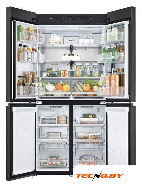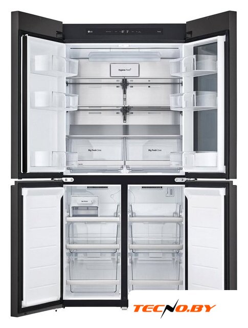 отдельностоящий, полный No Frost, сенсорное управление, класс A+, полезный объём: 570 л (371 + 177 л), инверторный компрессор, подсветка корпуса, диспенсер, складная полка, лоток для яиц, отделка: стекло, 91.4x72.9x179.2 см, черный