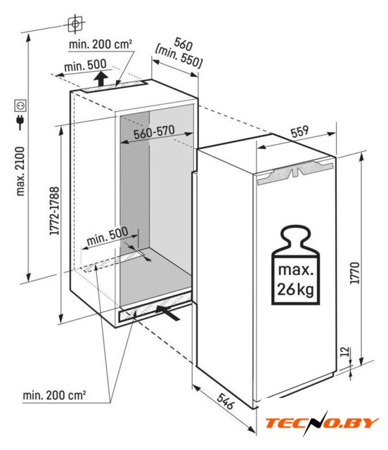 встраиваемый, без No Frost, электронное управление, полезный объём: 270 л (200 + 70 л), перенавешиваемые двери, лоток для яиц, 54.1x54.8x177.2 см, белый