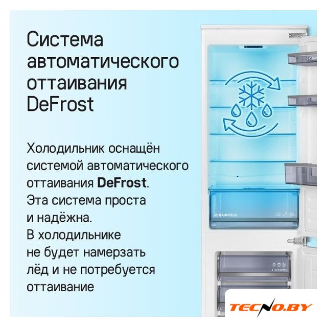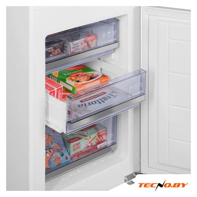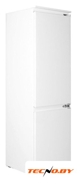 встраиваемый, полный No Frost, электронное управление, класс A, полезный объём: 284 л (215 + 69 л), инверторный компрессор, зона свежести, перенавешиваемые двери, полка для вина, лоток для яиц, 54x54.5x193.5 см, белый