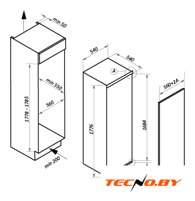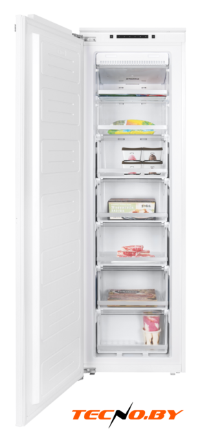 встраиваемый, без No Frost, электронное управление, класс A, полезный объём: 254 л (185 + 69 л), перенавешиваемые двери, лоток для яиц, 54x54.5x177.5 см, белый