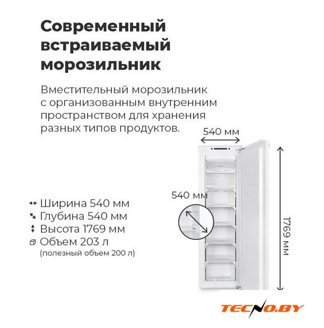 встраиваемый, жесткое, No Frost (морозильная камера), электронное управление, класс A+, полезный объём: 197 л, перенавешиваемые двери, 54x54.5x177 см, белый