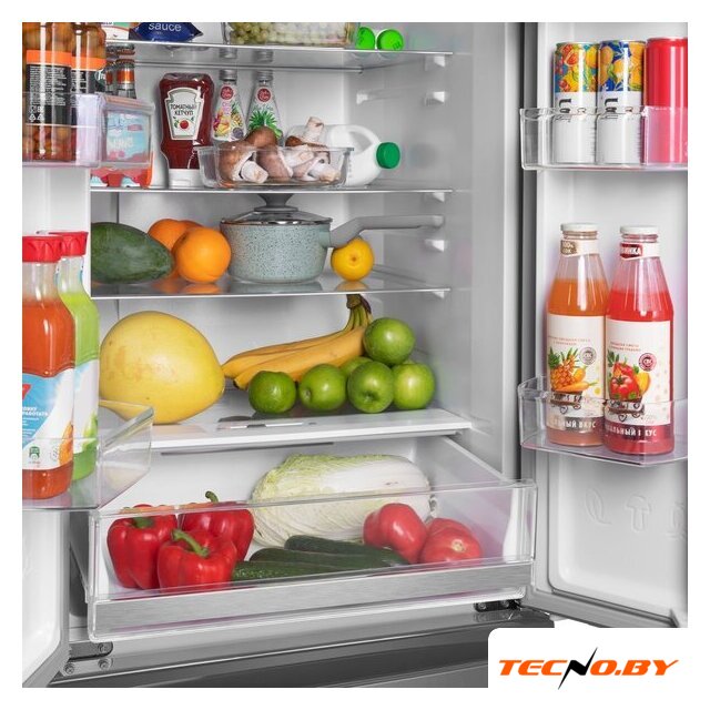 MAUNFELD MFF180NFSE01 обладает объемом 365 литров, предлагая вам 224 литра для хранения продуктов в холодильной камере и 113 литров в морозильной. Вы оцените это устройство с французской дверью за удобство и функциональность. Четыре стеклянные полки и шесть дверных балконов помогут организовать пространство по вашему вкусу. Не забытым остался и ящик для овощей и фруктов с регулировкой влажности.