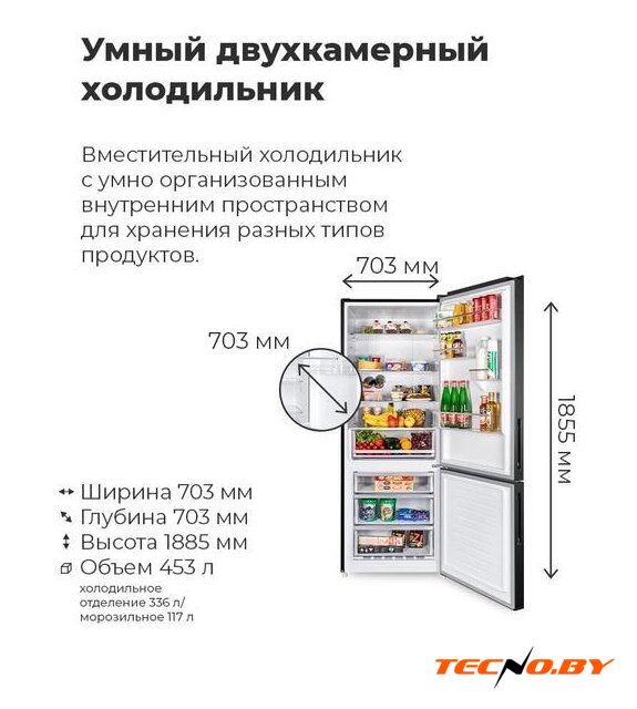 отдельностоящий, полный No Frost, электронное управление, класс A+, полезный объём: 474 л (320 + 154 л), инверторный компрессор, лоток для яиц, отделка: стекло, 78.3x70.9x181.1 см, черный