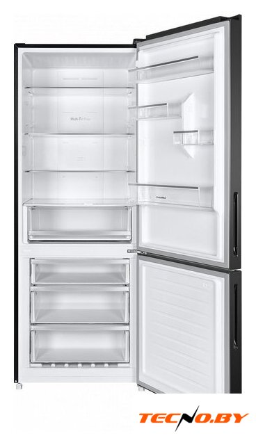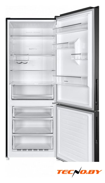 отдельностоящий, полный No Frost, электронное управление, класс A+, полезный объём: 466 л (283 + 183 л), инверторный компрессор, лоток для яиц, отделка: стекло, 91x60x183.6 см, черный