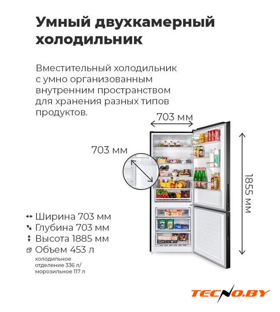 отдельностоящий, полный No Frost, электронное управление, класс A+, полезный объём: 384 л (277 + 107 л), инверторный компрессор, перенавешиваемые двери, лоток для яиц, 59.5x68.2x203 см, мраморный