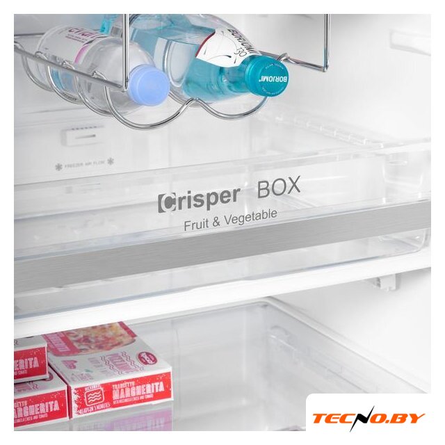 Холодильная камера оборудована двумя ящиками для овощей и фруктов и тремя пластиковыми дверными балконами, предоставляя достаточно места для различных видов продуктов. В комплекте идет полка для вина и лоток для яиц, добавляя возможность расширенного хранения.