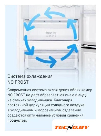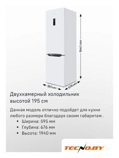 отдельностоящий, полный No Frost, электронное управление, класс A+, полезный объём: 417 л (288 + 129 л), инверторный компрессор, лоток для яиц, 83.6x63.6x183 см, синий