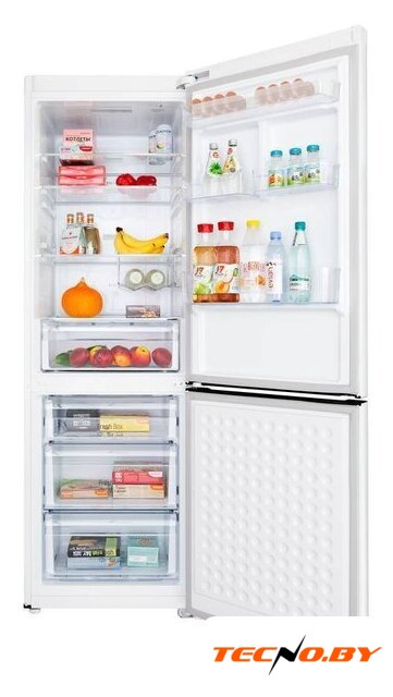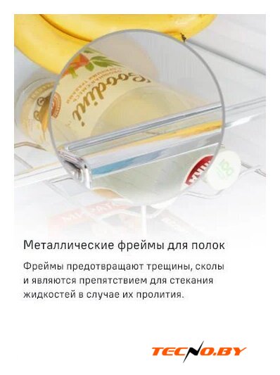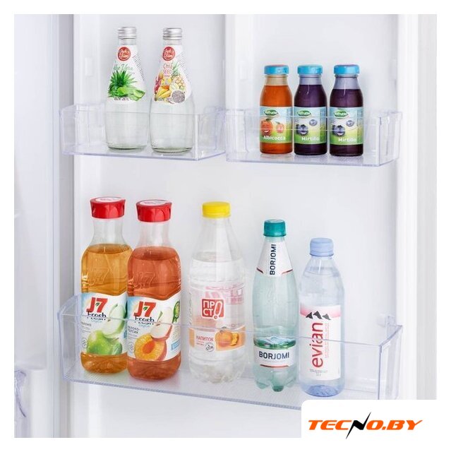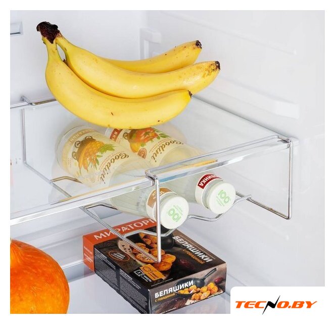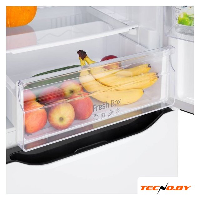 В холодильной камере присутствует полка для вина и лоток для яиц, что обеспечивает отличную организацию пространства. Четыре стеклянные полки и один ящик для овощей и фруктов делают хранение удобным, а пластиковые дверные балконы прекрасно справляются с размещением более мелких продуктов.