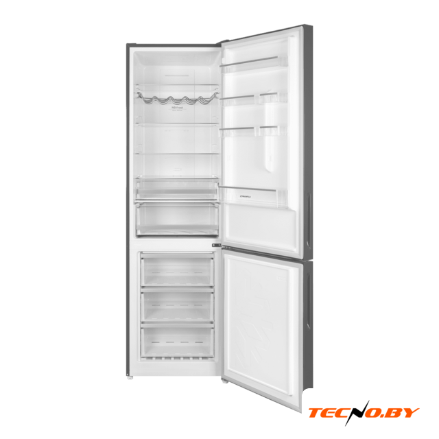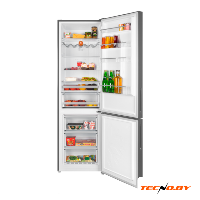 отдельностоящий, No Frost (морозильная камера), электронное управление, класс A, полезный объём: 319 л (225 + 94 л), инверторный компрессор, перенавешиваемые двери, подставка-лоток для бутылок, лоток для яиц, 59.7x67.5x185.5 см, серебристый
