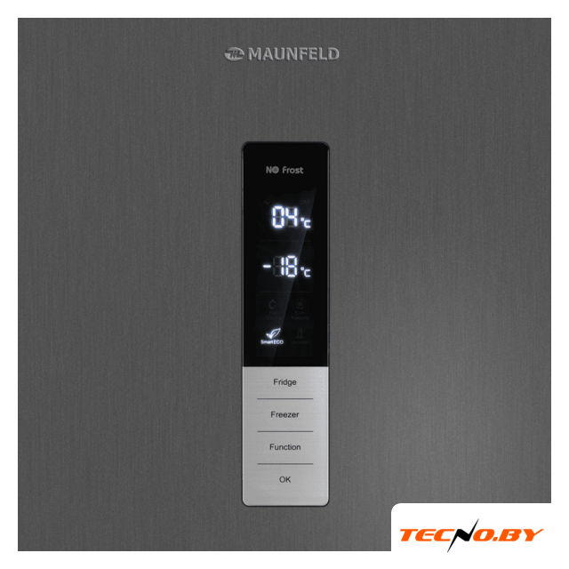 Электронное управление холодильником MAUNFELD MFF200NFSE удобно расположено снаружи и дополнено светодиодным дисплеем, что упрощает контроль температуры и выбор режимов работы. Разнообразие функций, таких как ECO, отпуск и сигнал открытия двери, добавляют удобства и энергоэффективности (класс A+).
